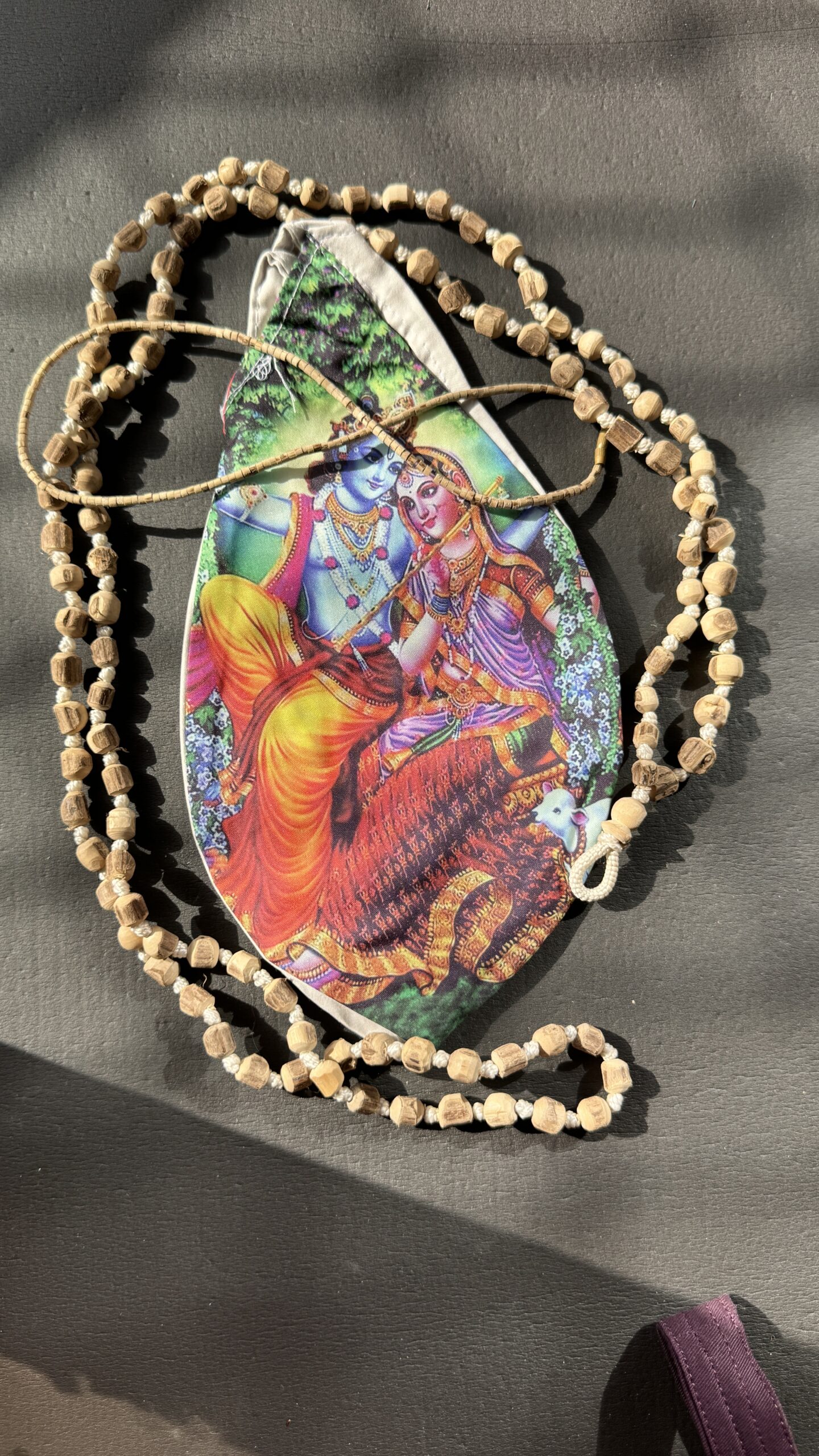 1️⃣ Japa Bag — made of soft fabric with a Vaishnava-style print (design is random). Designed to protect your japa beads during practice; durable and comfortable to use.